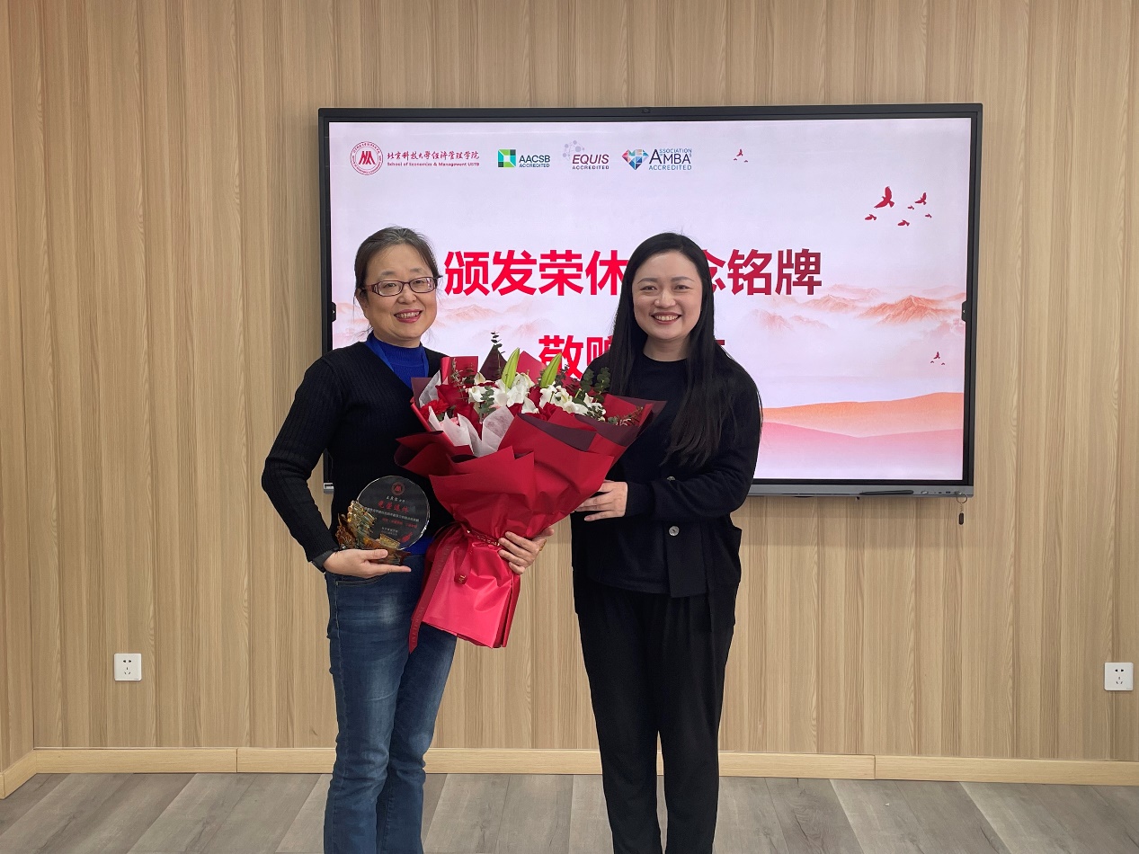 随后,学院副书记、副院长、工会主席倪宇发表致辞。倪宇代表学院对王老师多年来在教书育人、学科发展、支部建设等方面为学院所做的贡献表示衷心感谢,同时送上退休后诚挚的祝福。现场为王宾容老师颁发荣休纪念铭牌,并献上鲜花。
