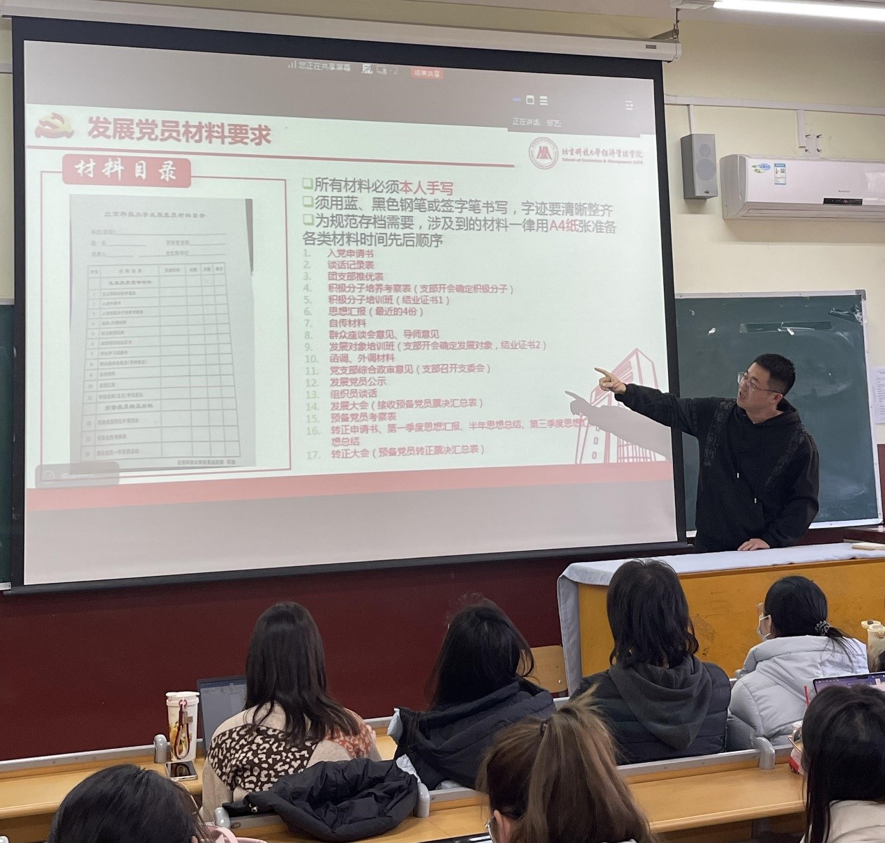 随后,邹艺详细解读了“发展党员工作流程”与“材料撰写要求”,系统梳理了从递交申请书到成为正式党员的每个关键步骤,对《入党积极分子培养考察表》的填写要求进行详细说明,并重点讲解了党员发展名额分配原则与党员发展多维考核标准。