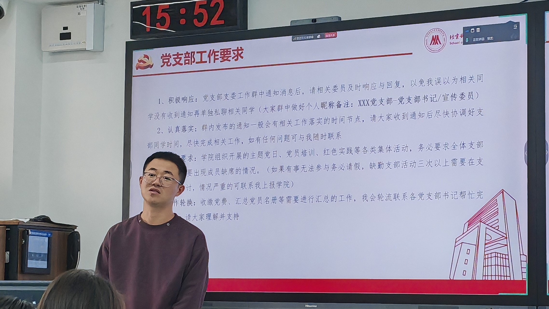 活动伊始,邹艺明确了党支部书记、组织委员(兼纪检委员)和宣传委员的具体分工,强调支部书记要发挥带头作用,按要求组织好支部会议与党员活动,做好党员发展与教育工作;组织委员(兼纪检委员)要做好支部党员信息管理、党费收缴、组织关系转接与支部活动签到等工作;宣传委员应做好支部活动宣传、新闻稿撰写与支部工作记录等工作。
