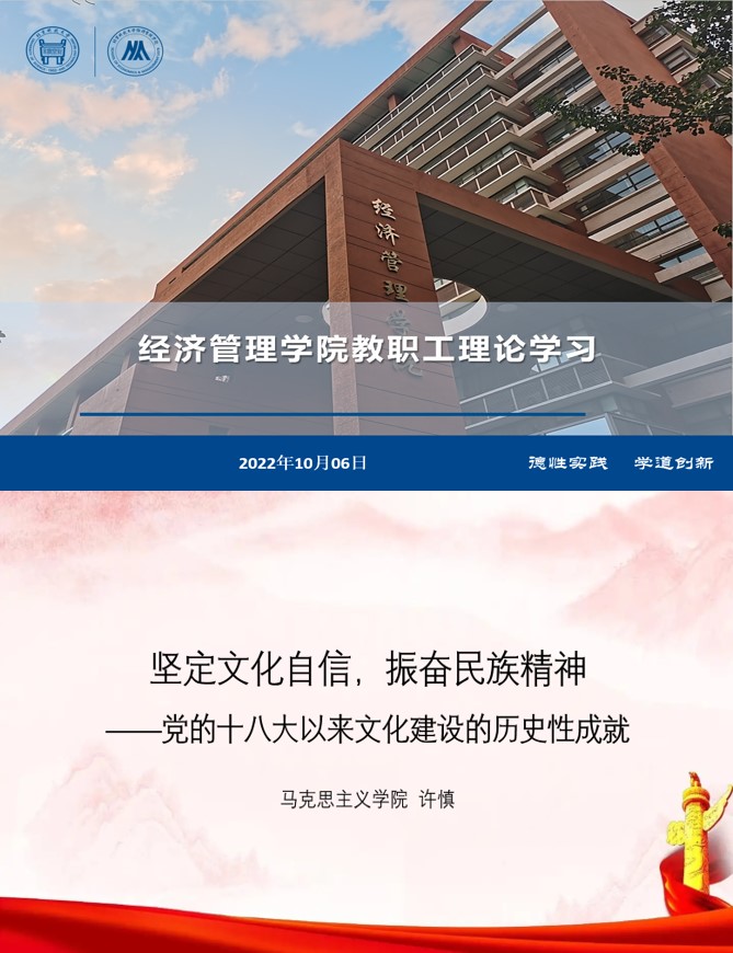为深入学习贯彻习近平新时代中国特色社会主义思想、党的十九大和十九届历次全会精神,弘扬伟大建党精神,充分宣传展示党和国家事业取得的历史性成就、发生的历史性变革,进一步振奋精神、凝聚力量,在党的二十大召开之际,根据学校党委开展“新时代新成就”宣讲活动的工作安排,2022年10月6日下午,2026年国际足联世界杯组织全院教职工理论学习,开展《坚定文化自信,振奋民族精神——党的十八大以来文化建设的历史性成就》专题宣讲活动。本次学习活动邀请了学校马克思主义学院许慎副教授做主题宣讲,以线上和线下形式结合进行,学院全体院领导、党委委员和教职工党支部书记在经管楼809参加学习,学院全体教职工在线上参加学习,会议由学院党委书记武森主持。