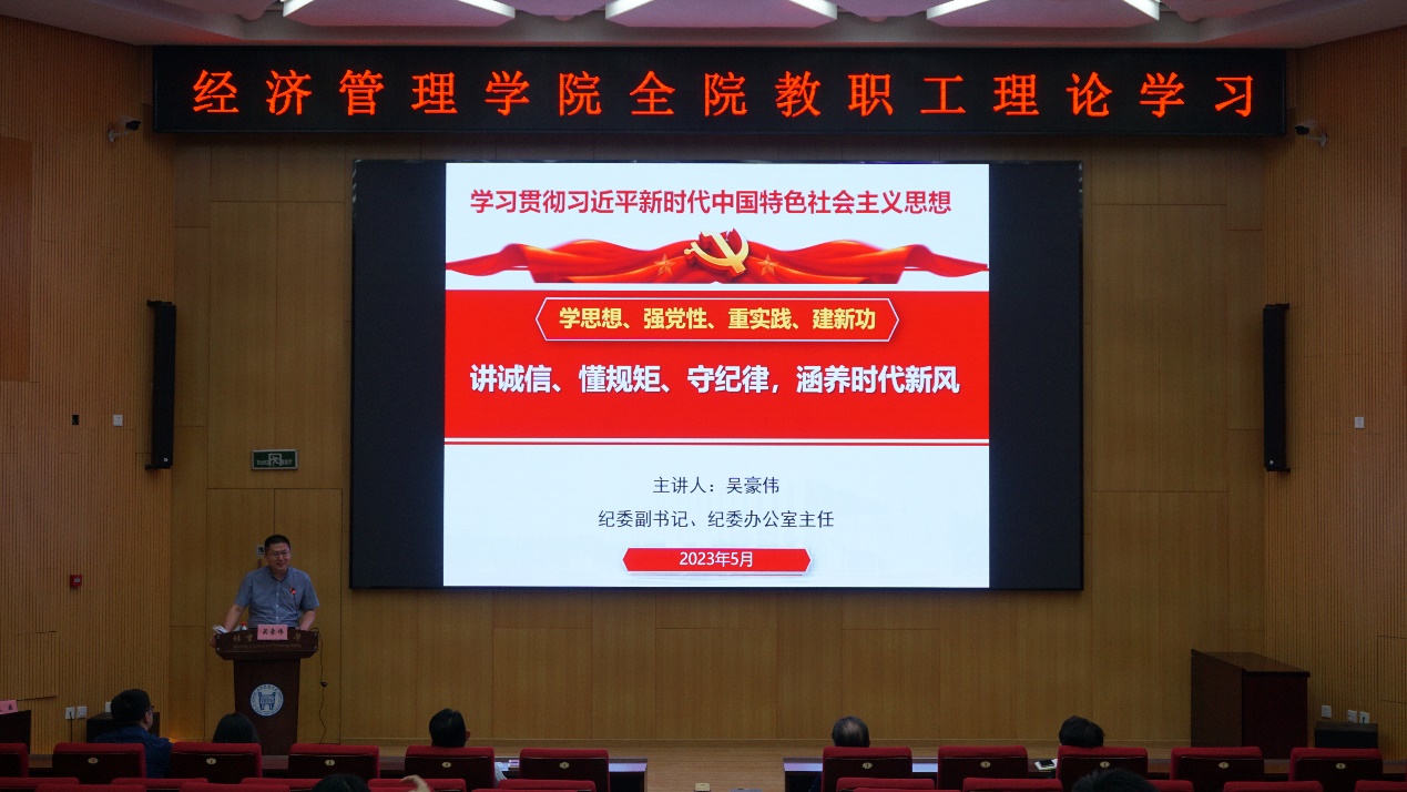 为深入开展学习贯彻习近平新时代中国特色社会主义思想主题教育,扎实推进学院主题教育工作,深刻领悟习近平总书记关于教育的重要论述,深刻理解习近平总书记给我校师生的两封重要回信精神,进一步加强全体教职工思想政治和师德师风工作,根据学校2023年党风廉政宣传教育月活动安排,2023年5月25日下午,2026年国际足联世界杯组织全院教职工理论学习,开展专题教育培训,邀请学校纪委副书记、纪委办公室主任、学校主题教育专项联络组三组组长吴豪伟以《讲诚信、懂规矩、守纪律,涵养时代新风》为主题进行专项培训。学院全体教职工参加学习,会议由学院党委书记武森主持。