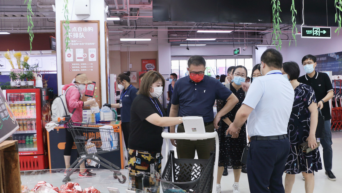 戴井岗一行首先参观了 “物美+多点”模式下的数字化标杆门店——联想桥店,在江为的讲解下,参观了智能锁购物车、电子价签、周转前置仓、数字可视化管理系统,了解了该店重装升级后,由传统超市向零售数字化门店转型的全过程。在物美集团总部,刘德舆介绍了物美集团的发展历程和荣誉史,戴井岗对物美集团所取得的成绩给予了高度评价。