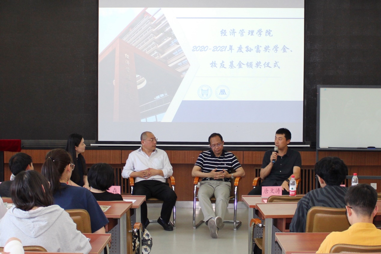 本届“榜样经管”获得者之一的杨一帆同学代表全体获奖学生发言,表达了对学院培养和校友关怀的衷心感谢,讲述了自己的成长历程并号召同学们不忘初心、艰苦奋斗、努力学习、全面发展、志存高远、乐于奉献。