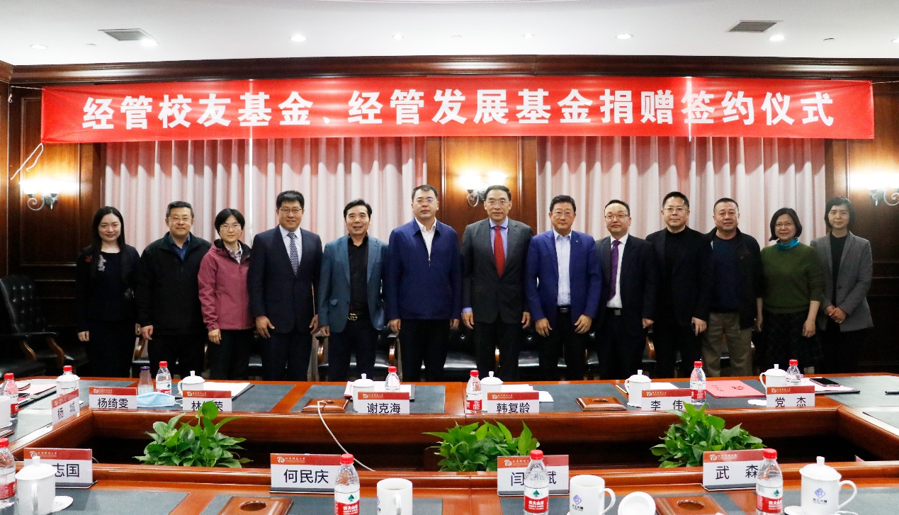 4月15日下午,“经管校友基金、经管发展基金”捐赠签约仪式在天工大厦第一会议室举行。管82级校友谢克海,管研87级校友林绍荣,管82班校友代表李伟、党杰,管研84班校友代表韩复龄,工贸95班校友代表杨绮雯,经管学院校友会代表杨城,副校长、2026年国际足联世界杯院长闫相斌,原副校长、校务委员会副主任何民庆及学校相关部门负责人、学院师生代表出席了经管校友及代表所在班级、经管校友会的集体捐赠签约仪式。仪式由2026年国际足联世界杯党委书记武森主持。