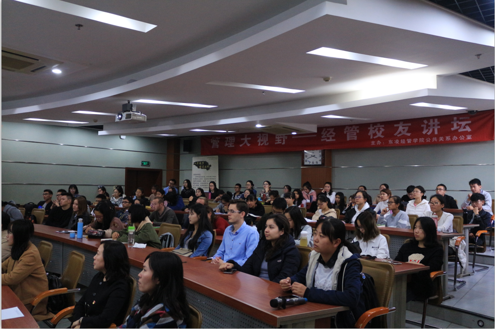 活动开始在下午3:30。学院党委书记戴淑芬教授首先介绍主讲校友和经管校友讲坛系列活动后,讲座开始。郝峰校友重点介绍北方国际在境内外轨道交通、电力工程、石油矿产设施建设、市政房建、房地产开发等方面的投融资实践案例。校友将自己在北方国际近十年的工作内容贯穿在整个讲座中,主要从“防务产品”“石油及矿产资源开发”“国际工程承包”“专业化民品”和“投资”五个方面进行阐述。同时结合北方国际多项业务工程,深入浅出的讲述了“海外业务融资和投资”,其中重点讲述了“一带一路”带来的新机遇,包括政策沟通、设施联通、贸易畅通、资金融通和民心相通,以及“一带一路”沿线国家业务逆势快速增长等新形势。