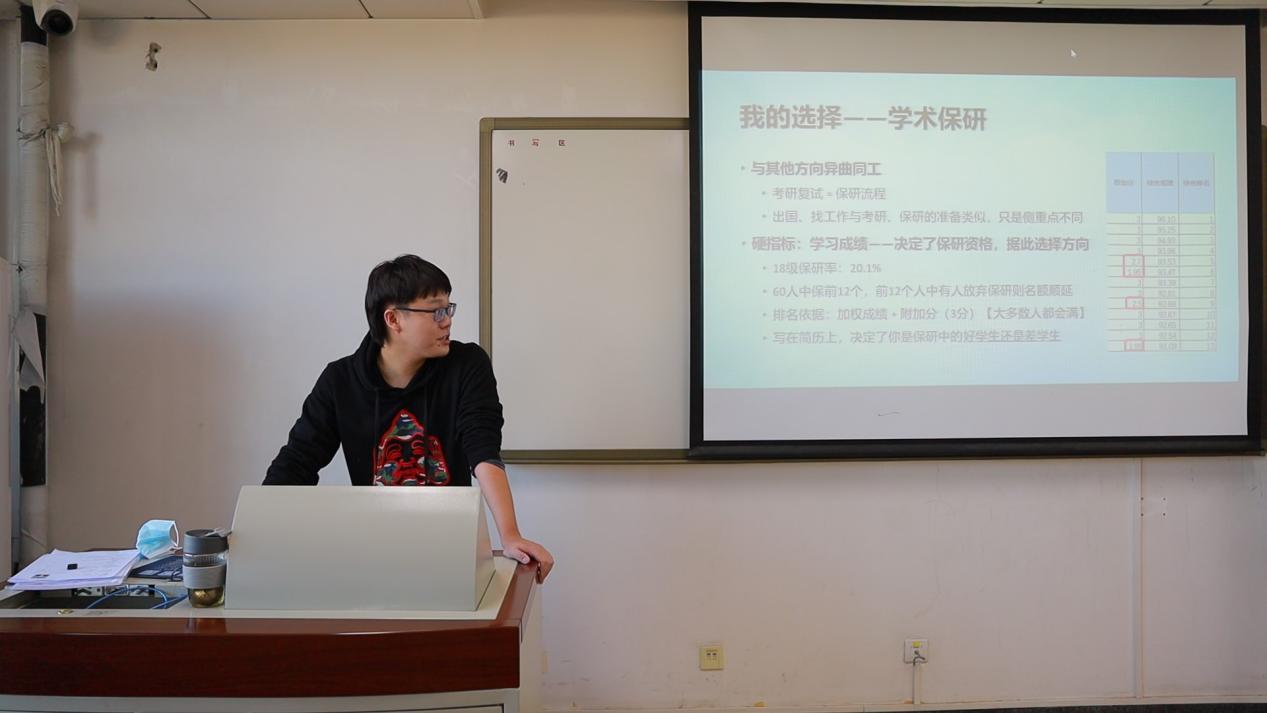 谦叙婉述,指点迷津。冯子函学长从保研、考研、出国与工作四个方面分别进行了详细分析。对于自身熟悉的选择方向,如保研、考研,冯子函学长毫无保留地说明其中的细节,保证同学们不会在不必要之处浪费精力与时间;对于自己相对不熟悉的方向,如出国、工作,学长仍在参考大量信息后给出合理的建议,为同学们从更高的角度带来新的想法。