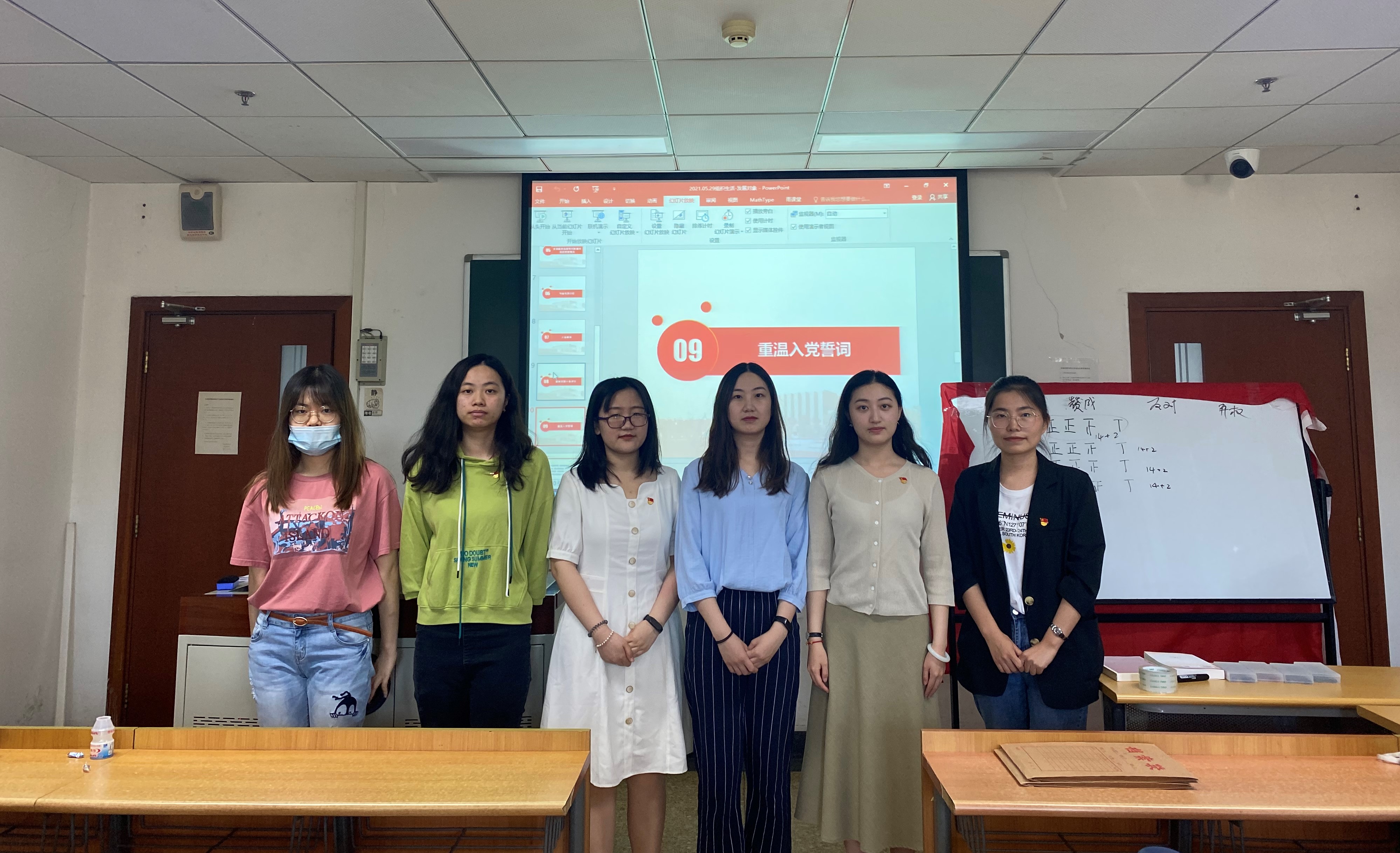 在与会党员充分讨论后,经全体正式党员无记名投票表决,一致同意吸收董雅贤、孙艺源、沐嘉慧和宗慧敏四位同志为中共预备党员。最后,由支部委员南瑞娟、魏雨含同志为四位同志佩戴党徽,全体参会人员一同重温了入党誓词。