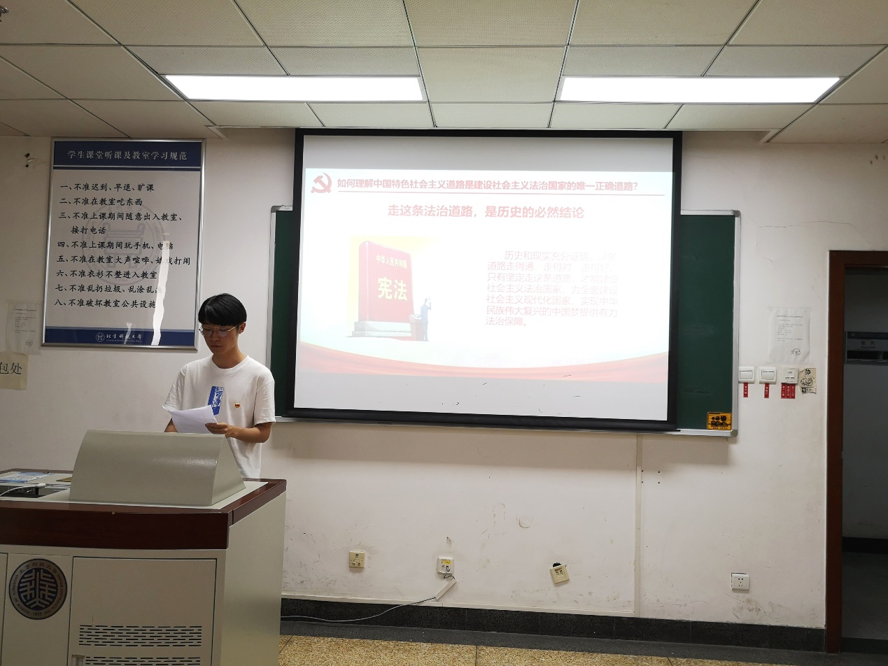 支部第一小组成员程航、杜重山及赵朔针对《习近平新时代中国特色社会主义思想学习问答》“四个全面擎宏图”篇的六大问题,由习近平总书记在陕西延安梁家河的小村庄七年知青岁月的故事引入,分享全面建成小康社会,充分彰显了中国特色社会主义制度的强大生命力和巨大优越性,显著提高了我国国际地位,为广大发展中国家解决贫困问题、实现现代化贡献了中国智慧、中国方案。通过近代、建国、改革开放以来的对比,总结到我国对外开放不断向纵深发展,逐步形成从沿海到沿江、从沿边到内陆,多层次、多渠道、全方位开放的新格局。同时通过视频深入学习只有坚定中国特色社会主义道路,才能建设社会主义法治国家,为全面建设社会主义现代化国家、实现中华民族伟大复兴的中国梦提供有力法治保障。