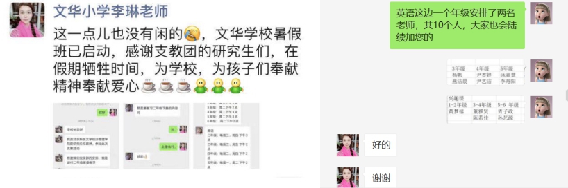在支教活动正式开始之前,支部书记尹香婷于7月12-13日与文华学校校长李琳在共建支教活动上进行沟通协商,就课程、时间安排等方面达成一致并完成了对接,随即成立管工研19党支部支教活动筹备小组进行交流探讨,确定课程规划和人员安排。随后,在组织委员黄梦禧和宣传委员巩忠霞的带领下分别成立兴趣课课程组和英语课课程组。支部成员从构思到筹备,从讨论到分工,洋溢着投身志愿活动的真挚热情与青年人的责任担当意识,为做好支教前期准备付出了辛勤的努力。