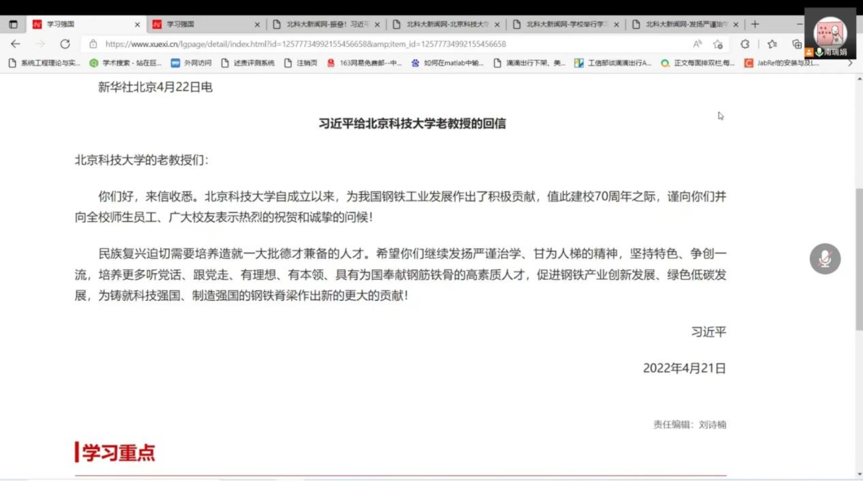 与会成员围绕学习贯彻习近平总书记回信的感想展开了热烈讨论,均表示大受鼓舞、振奋人心。潘瑾琼同志表示“习近平总书记在三年内给北科大回复了两封信,这份心情是与有荣焉的。作为新一代共产党员,我将努力成为听党话、跟党走、有理想、有本领、具有为国奉献钢筋铁骨的高素质人才,和北科大一起促进钢铁产业创新发展、绿色低碳发展,为铸就科技强国、制造强国的钢铁脊梁作出新的更大的贡献!”张静怡同志表示“一直觉得收到习近平总书记回信,是一件遥不可及的事情,习近平总书记的回信表达了对我校实力和能力的认可,并为我校指明发展的方向,以后我们更应该秉承‘求实鼎新’的校训精神,无私奉献,甘为人梯,成为国家的栋梁之材,未来不负国家不负己。”