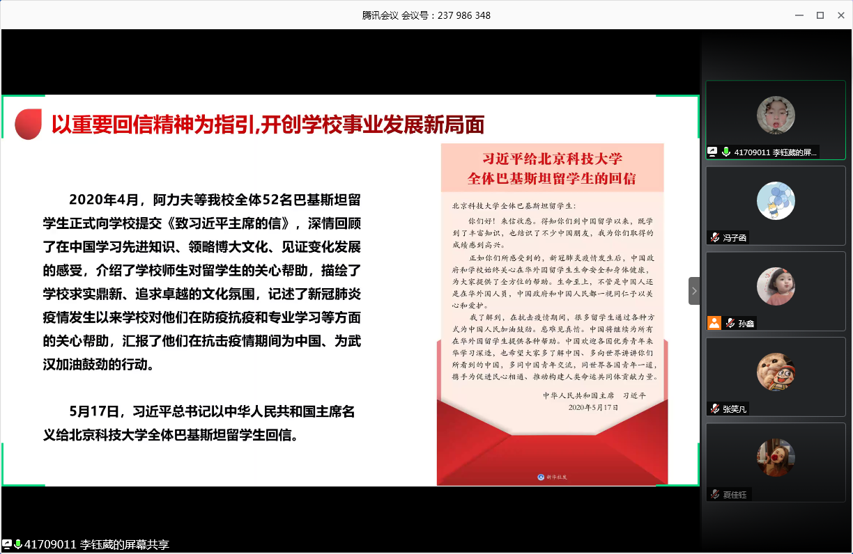 会议的第一部分,由王灏、李钰葳带领大家学习习总书记重要回信精神。在学习中,两位同学带领大家重温习主席给2026年国际足联世界杯全体巴基斯坦留学生的回信,学习我校党委书记武贵龙、校长杨仁树就全面深入学习宣传贯彻总书记重要回信精神的部署与要求。