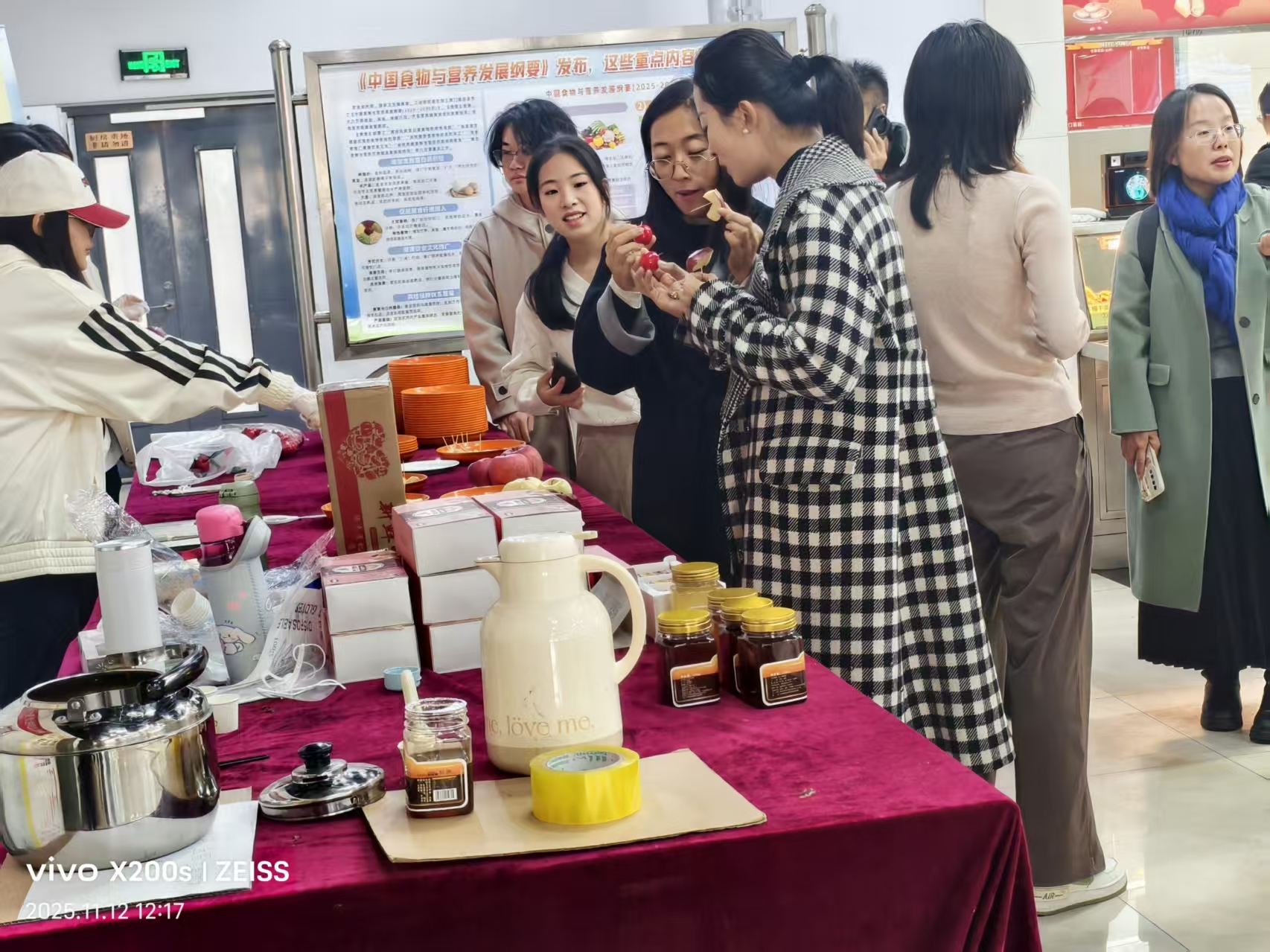 活动期间,老师与同学们热情高涨,纷纷驻足咨询、选购。营销团队成员们将新鲜的苹果切成小块,蜂蜜也用小样装好,方便老师同学们拿取和品尝。