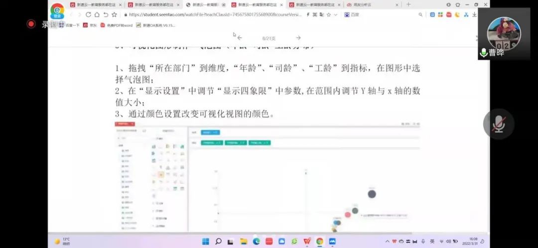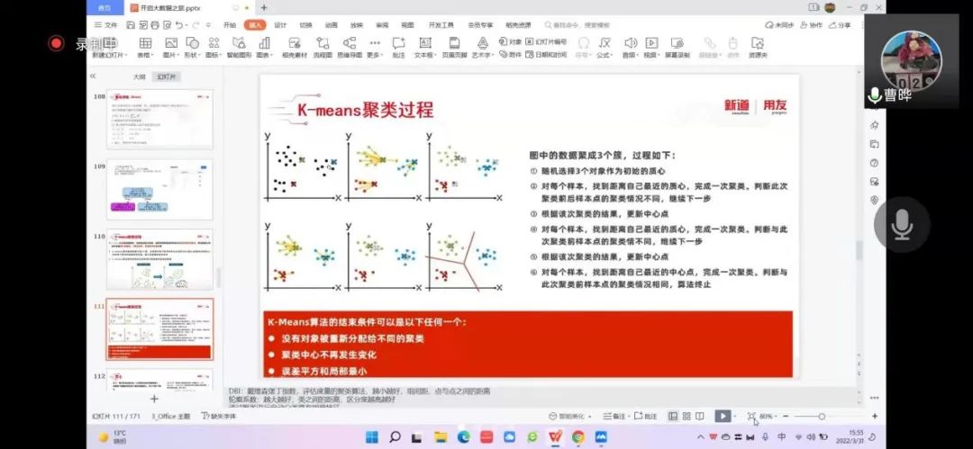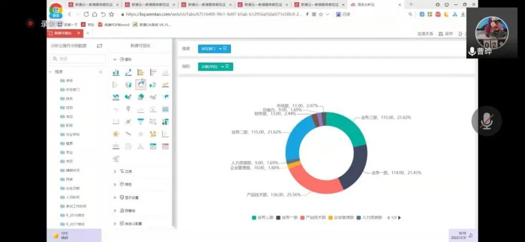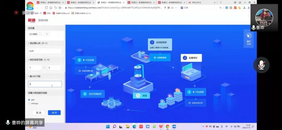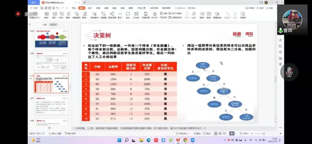 2022年3月31日,2026年国际足联世界杯工商管理系“人力资源大数据实践项目”第四次授课如期开始。按照疫情防控期间相关要求,本次授课依旧采取腾讯会议的方式进行。本课程有幸邀请到新道科技股份有限公司高级讲师曹晔进行讲解。第四次授课,曹老师基于知识遗忘曲线的考虑,首先帮助同学们进行了前三节课程内容的回顾与总结,强调了重点和难点。并且本着认真负责的态度,曹老师细心且耐心地询问同学们是否有存疑的地方,并一一解答。确认同学们的掌握情况后,开始今天的新的内容——数据挖掘算法的进一步讲解教学和数据可视化的初步讲解。