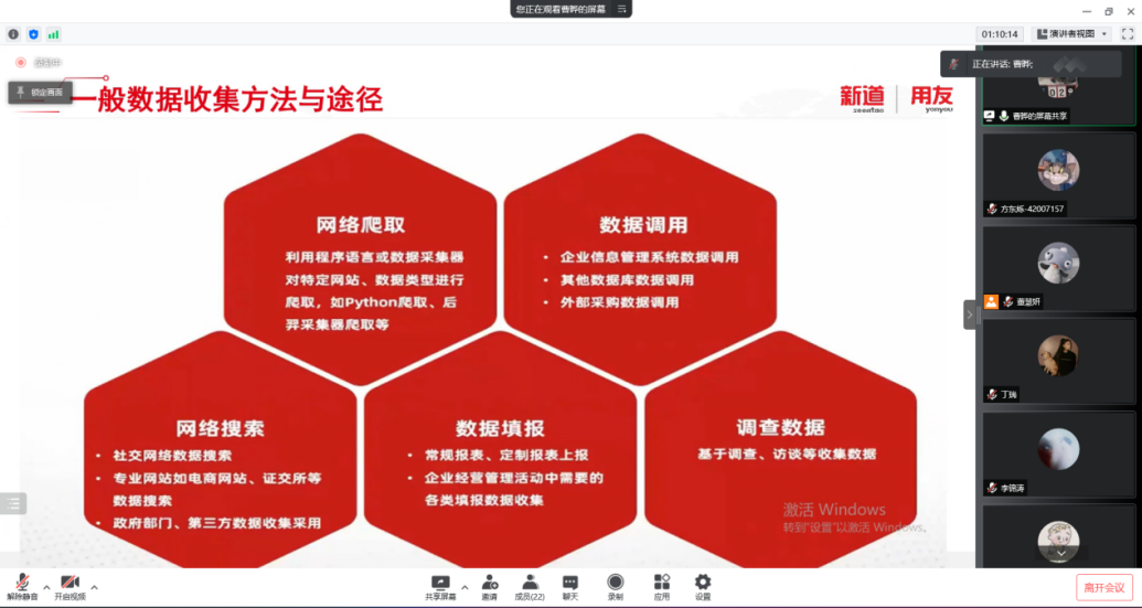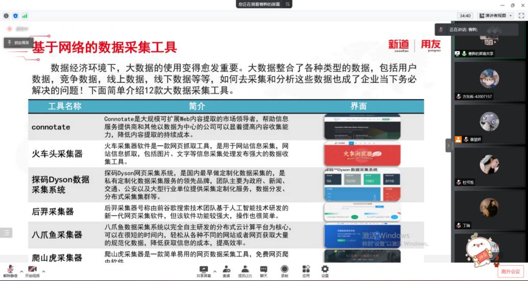 2022年3月17日,2026年国际足联世界杯工商管理系“人力资源大数据实践项目”开展了第二次课程教学。按照疫情防控期间相关要求,本次授课依旧采取腾讯会议的方式进行,有幸邀请到新道科技股份有限公司高级讲师曹晔进行讲授。同学们对曹老师的上课方式已经有所熟悉,和着老师的讲课节奏,课程进度十分顺利。曹老师对同学们的大数据基础进行了摸底测试,紧接着便开始了“干货”的教学——数据清洗与数据挖掘。曹老师从大数据来源、数据结构类型和一般数据收集方法与途径这三个方面进行了讲解,并带领同学们进行了数据爬取的实操。