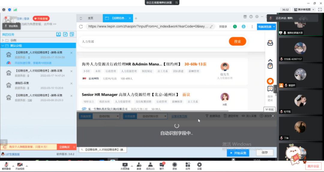 曹老师告诉同学们使用的爬虫程序不仅可以获取新道人才网的信息,还可以去其他人才网站爬取人才资源信息,像猎聘网、58同城、BOSS直聘等网站都是选择的对象,并以猎聘网为例示范了人力资源数据爬取的操作。