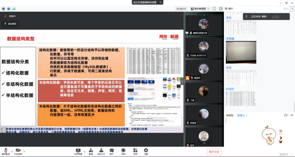 在数据结构类型方面,曹老师介绍了三种数据结构:结构化数据、非结构化数据和半结构化数据。一般情况下非结构化数据占用内存较大,因为它常常包含图像、声音、网页和视频等信息。