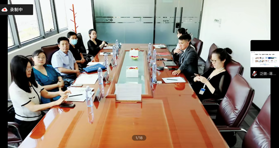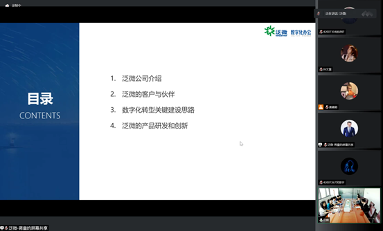 接下来,线下人员移步会议室,开启腾讯会议,进行了线上、线下的报告分享,由泛微售前总监蒋总讲授,主题为“智能-协同-信创:助力组织数字化转型——泛微数字化办公平台”。蒋总首先介绍了泛微业务内容、泛微发展路径,然后介绍了泛微的客户与合作伙伴策略,接着重点讲解了泛微助力企业数字化转型关键建设思路和泛微的产品研发和创新。
