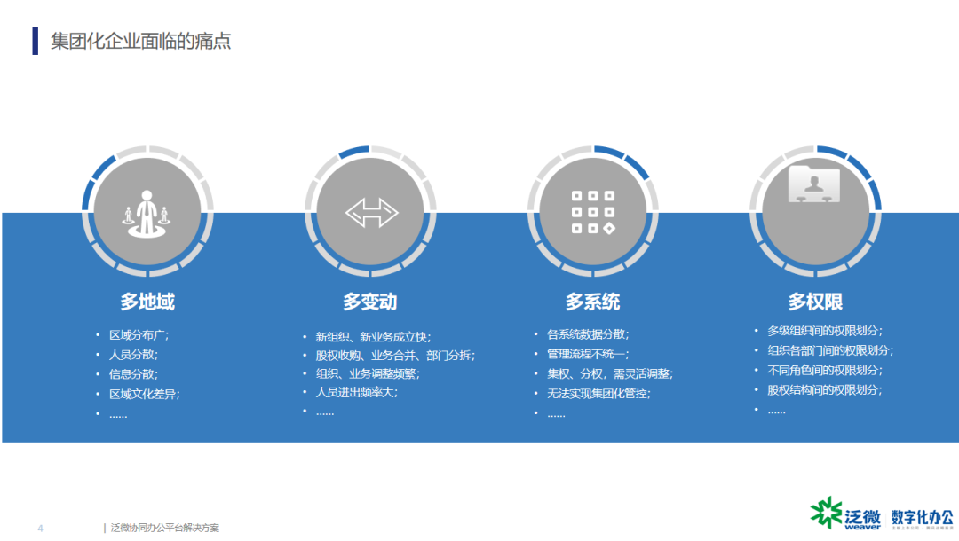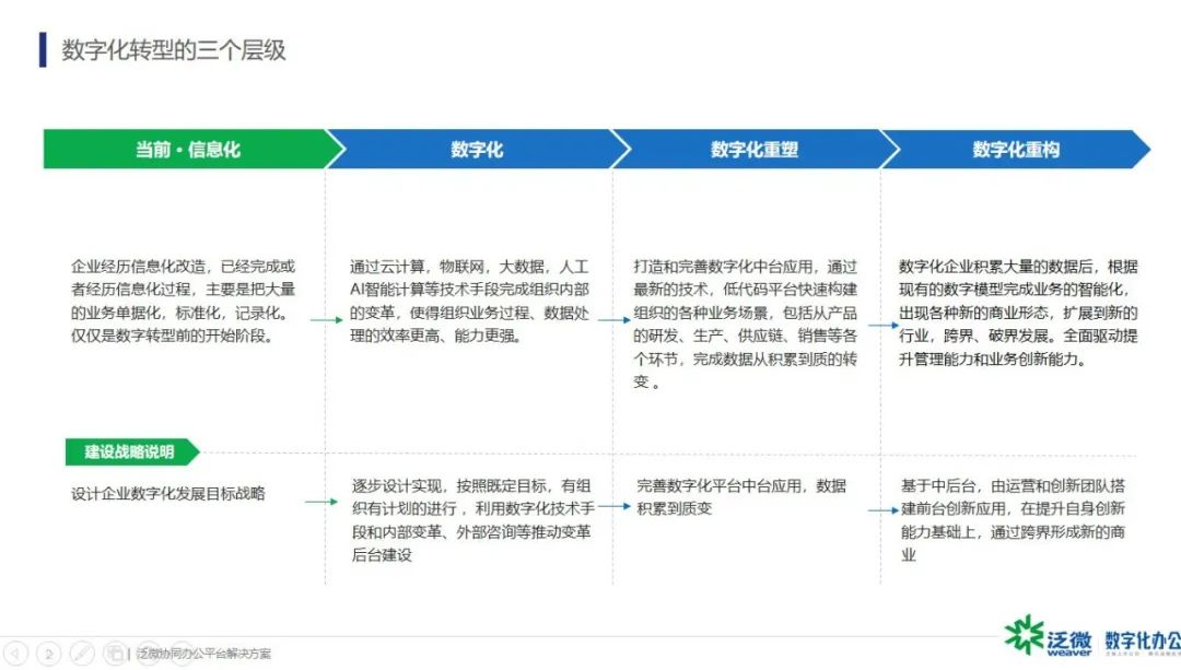 在介绍中,蒋总提到了当今时代发展越来越快,用户群体也在不断扩大,带来的困难也随之变多,权限设计也需要更加细致,结合当下数字化转型的关键思路(即向数据时代、移动时代、智能化、大整合四个方向进发),泛微也对传统OA进行了数字化转型升级,改造传统业务,融合时代要求,不断创新发展。在经历数字化转型的三个层次:数字化,数字化重塑,数字化重构后,泛微建立了低代码平台以快速构建个性化的服务OA,更好地满足客户需求,打破界限,实现跨界发展。