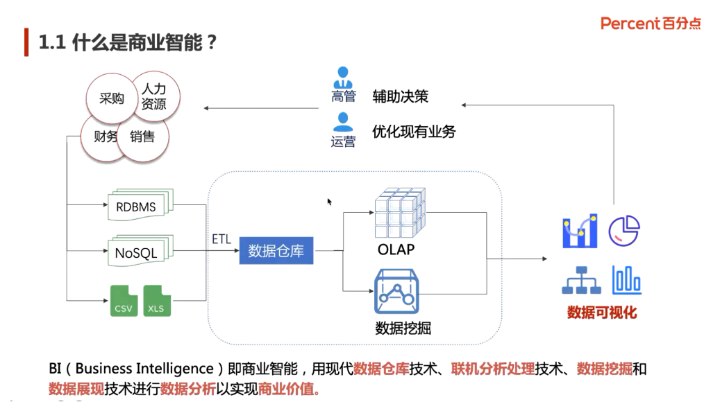乔老师首先讲解了上次SQL所留下的课堂作业,总结了课后同学们在微信群中遇到的常见性问题,逐一进行讲解,随后进入本节课的BI学习。第一部分,从商业智能BI(Bussiness Intelligence)六个方面进行概念介绍,首先,将BI工具与BI进行概念区分并介绍描述将数据从来源端经过抽取(extract)、转换 (transform)、加载(load)的ETL。企业所有级别的决策制定过程,提供所有类型数据支持的战略集合的数据仓库。从海量的数据集中选择、探索、识别出有效的、新颖的、具有潜在效用的乃至最终可理解的模式的数据挖掘以及OLAP--数据仓库系统的主要应用,它支持复杂的分析操作,侧重决策支持,并且提供直观易懂的查询结果。其次,讲解了对于BI类型进行报表式、传统式、自助式三个方式的划分。