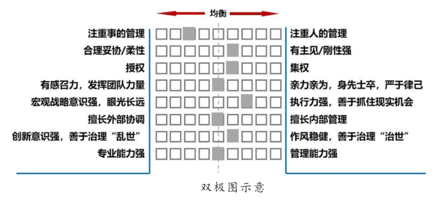 第二张示意图是谢教授首创的双极图。该图最理想的状态是评价的所有项均处于均衡的位置,在他调研的超1100名管理者中,没有哪位管理者是绝对完美的。同时,研究结果也表明,领导风格本身并不会对360度评价造成结构性影响。