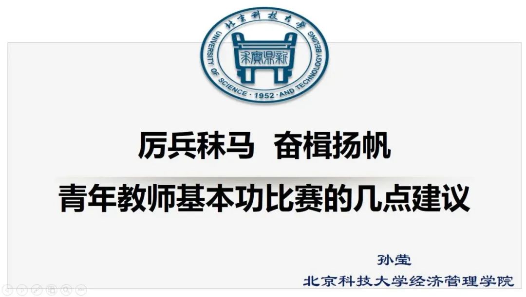 孙莹教授作为北京市名师有身经百战的教学比赛经验,她以“厉兵秣马,奋楫扬帆”为题向青年教师参加基本功比赛提出了几点建议。她告诉老师们选择教学基本功参赛主题时一定要注意其相对完整性、现实意义和趣味性,并从比赛两个部分即教案评比及现场课堂教学演示对青年教师进行培训。她从教学目的、教学内容、教学形式和教学手段方面介绍教案要求,并结合青年教师教学基本功比赛评分标准对课堂教学演示提出建议。