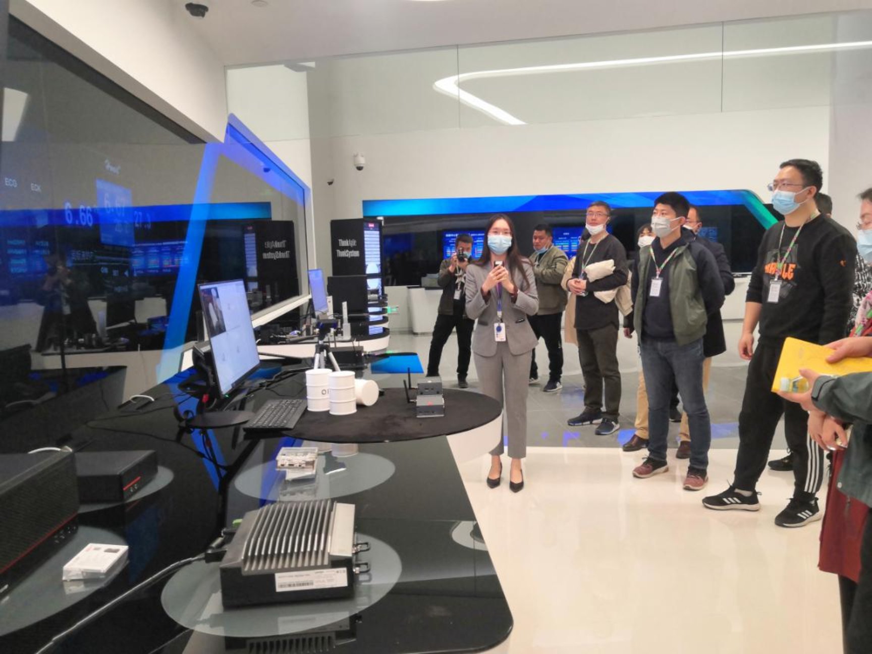 在二层的智慧行业展示区,讲解员为我们讲解了联想智能化变革的3S战略:智能物联网——智能基础架构——行业智能。围绕着3S战略联想已经建立了“端-边-云-网-智”的架构体系,并在此基础上持续推动与深化各行各业的智能化转型,大力布局智能物联产品、智慧服务和智慧行业解决方案的三大赛道,加速“联想·智慧生活”愿景的落地。对于数字中心基础构架的建设,从1995年传统基础结构的“分散采集,难以采购”的困难起步到目前软件定义数据中心的“整体虚拟化建设”,设备利用率从10%提升到70%,整体拥有成本下降30%-80%,耗时也从以周计数到以时计数,我们明白取得这样的成绩需要持续的投入以及对初心的坚守。