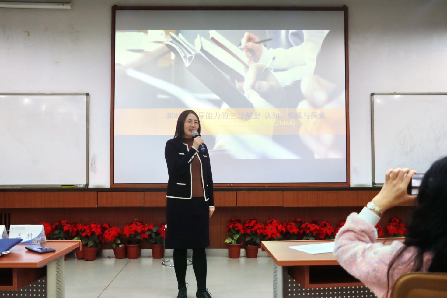 首先,王喆博士以“领导”一词的由来开篇,分别为同学们介绍了“三边模型”的方法边、信息边和经验边概念。其中,方法是基础,信息和经验是支撑。三角形面积越大,工作效果越好。当三边相等时,三角形面积最大。三边不可缺失其一,更不可相互分离。之后王博士结合案例重点讲述了提高战略思维、历史思维、辩证思维、创新思维、底线思维的重要意义,并引导同学们要善于发现规律、掌握规律、运用规律、驾驭规律。