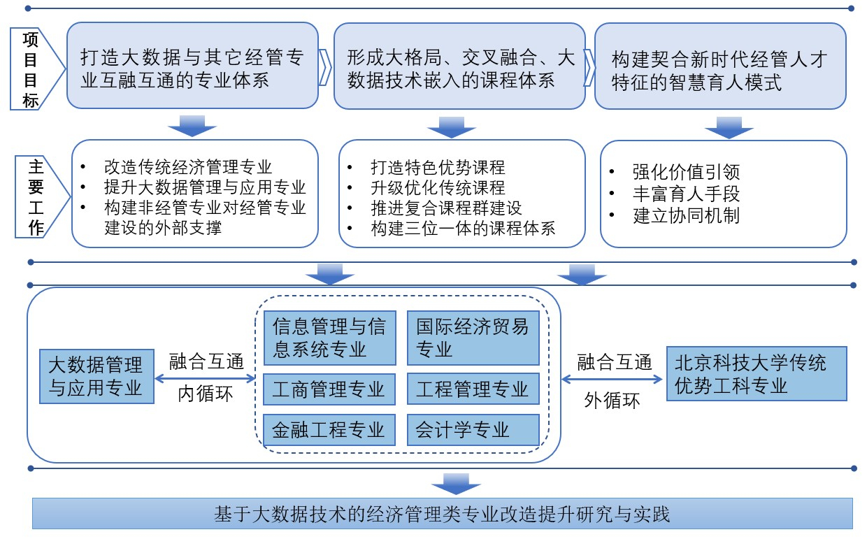 该项目将充分调研社会对新时代经管人才需求的变化趋势,深刻分析新时代文科高等教育的发展形势,遵循立德树人和融合创新的人才培养理念,将大数据技术融入到经管专业建设中。项目将改造和提升专业发展模式,打造大数据专业与其他经管专业互融互通、经管专业和传统优势工科专业互融互通的专业建设体系;将重构人才培养方案,通过打造优势课程、升级传统课程、推进复合课程群建设,形成交叉融合、大数据嵌入的课程体系;将变革人才培养模式,通过强化价值引领、丰富育人手段、完善人才培养机制,构建契合新时代经管人才特征的智慧育人模式。通过项目的研究,期望能将大数据技术发展与应用与专业体系、培养方案与培养模式有效结合,培养具有高尚道德情操、顺应时代发展、堪当民族复兴大任的高水平新时代经管人才。