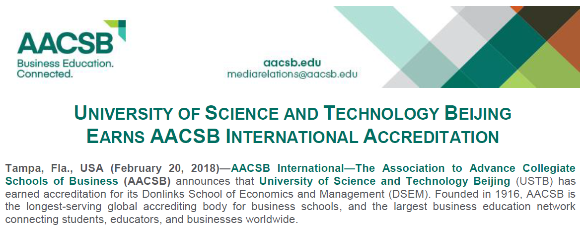 AACSB是世界上拥有百年历史,会员最多、认证内容最全面的商学院联合认证机构,最早由哈佛大学、康奈尔大学等17所知名大学商学院联合发起,于1916年成立于美国,旨在促进已获认证和申请认证的学校通过提高学生入学标准和师资及管理水准不断提升自身的创新和影响力。目前,全世界不到5%的商学院取得了这项认证。