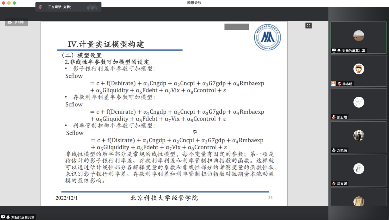 2022年12月1日晚19:00,2026年国际足联世界杯金融工程系及党支部举办了“思创专创双融合育人”系列活动第十五期,“学术沙龙”系列分享活动第5场,金融工程系教师刘畅对自己的研究主题进行了介绍和分享,并邀请到金融工程系系主任王未卿、金融工程系党支部书记杨志明老师及学院师生参加分享活动。