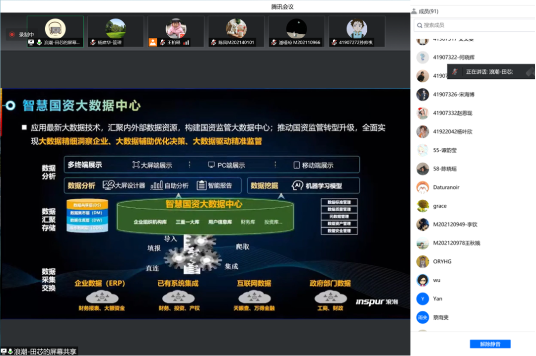 讲座开始,主持人王柏琳副教授向大家介绍了本次讲座的背景、目的以及意义。随后田芯老师受邀开始讲座。本次讲座围绕着数字化转型时代背景下浪潮大数据中台赋能数字化转型典型案例,详解大数据中台架构及其数据监管业务场景应用。首先介绍了政策层面上的信息,指出数字化、智能化是国家治理能力现代化的要求。分享了部分省、部委“国资云”实践以及集团企业数据监管的大数据系统实践。在“国资云”案例中,充分运用了云+数+AI构建国资监管大数据平台,利用大数据技术搭建现代化、流程化、系统化监测平台,构建多主题分析模型,对企业经济运行现状和发展态势进行全面深入的分析预警展示,助力实现用数据说话、用数据管理、用数据决策、用数据创新的工作机制,提升了监管的针对性和有效性。