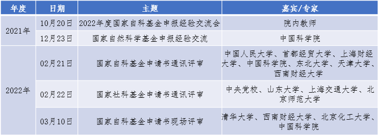 为了切实做好2022年度国家自然科学/社会科学基金申报工作,学院不断加大基金申报的组织与支持力度,同时丰富了申报服务的形式和内容。2021年10月至2022年3月,学院先后组织了5场次服务活动,其中包括基金申报动员及交流会2场、申请书函评会2场和申请书线下评审会1场,详见表1。活动邀请的专家包括清华大学、中国科学院等12所国内知名高校的教授共14人次。2022年3月5日至3月19日,学院集中对全部国家自科/社科基金申请书进行形式审查,避免非学术因素导致申请无效。
