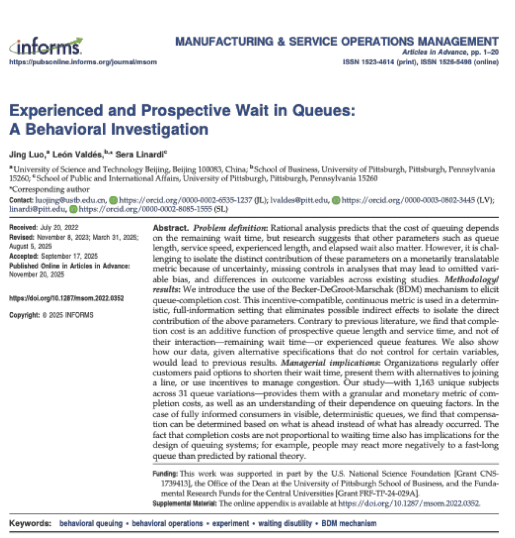 近日,世界杯官网管理科学系讲师骆靖作为论文第一作者,与匹兹堡大学副教授León Valdés 和Sera Linardi 合作撰写的学术论文《Experienced and Prospective Wait in Queues: A Behavioral Investigation》在UTD24列表期刊Manufacturing & Service Operations Management(M&SOM)发表。这是世界杯官网教师在M&SOM发表的首篇论文。