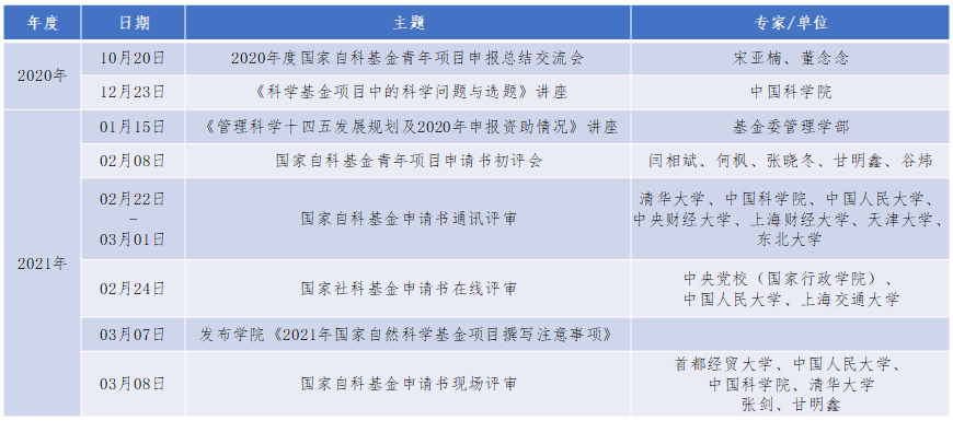 为了切实做好2021年度国家自然科学/社会科学基金申报工作,学院不断加大基金申报的组织与支持力度,同时丰富了申报服务的形式和内容。2020年10月至2021年3月,学院先后组织了6场次服务活动,其中包括基金申报动员及交流会3场、申请书线下评审会2场、申请书函评会和在线评审会各1场,详见表1。活动邀请的专家包括国家自然科学基金委管理学部相关专家,清华大学、中国科学院等10所国内知名高校的教授共16人次,院内教授共9人次。此外,学院发布了新版《2021年国家自然科学基金申请书撰写注意事项》,对申请书各部分的重点和要点进行了归纳总结,供申报教师进行要点对照。2021年3月5日至3月19日,学院集中对全部国家自科基金申请书进行形式审查,避免非学术因素导致申请无效。2021年3月20日,经学校科研院审核,全部申请书正式提交至国家自然科学基金委。