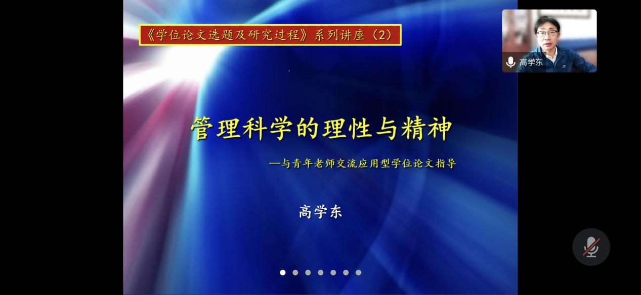 第一场讲座是由博士生导师高学东教授为大家带来的“应用型学位论文的选题与研究过程”,本次讲座以管理科学的本源以及研究过程为入手点,结合具有代表性的企业项目案例,探讨了工商管理学科研究选题与研究类型的本质,全面分析了应用型硕士论文的写作思路与写作要点,并对应用型硕士研究生学位论文的结构进行了简明扼要的阐述。众多MBA学生参与了本次线上讲座。