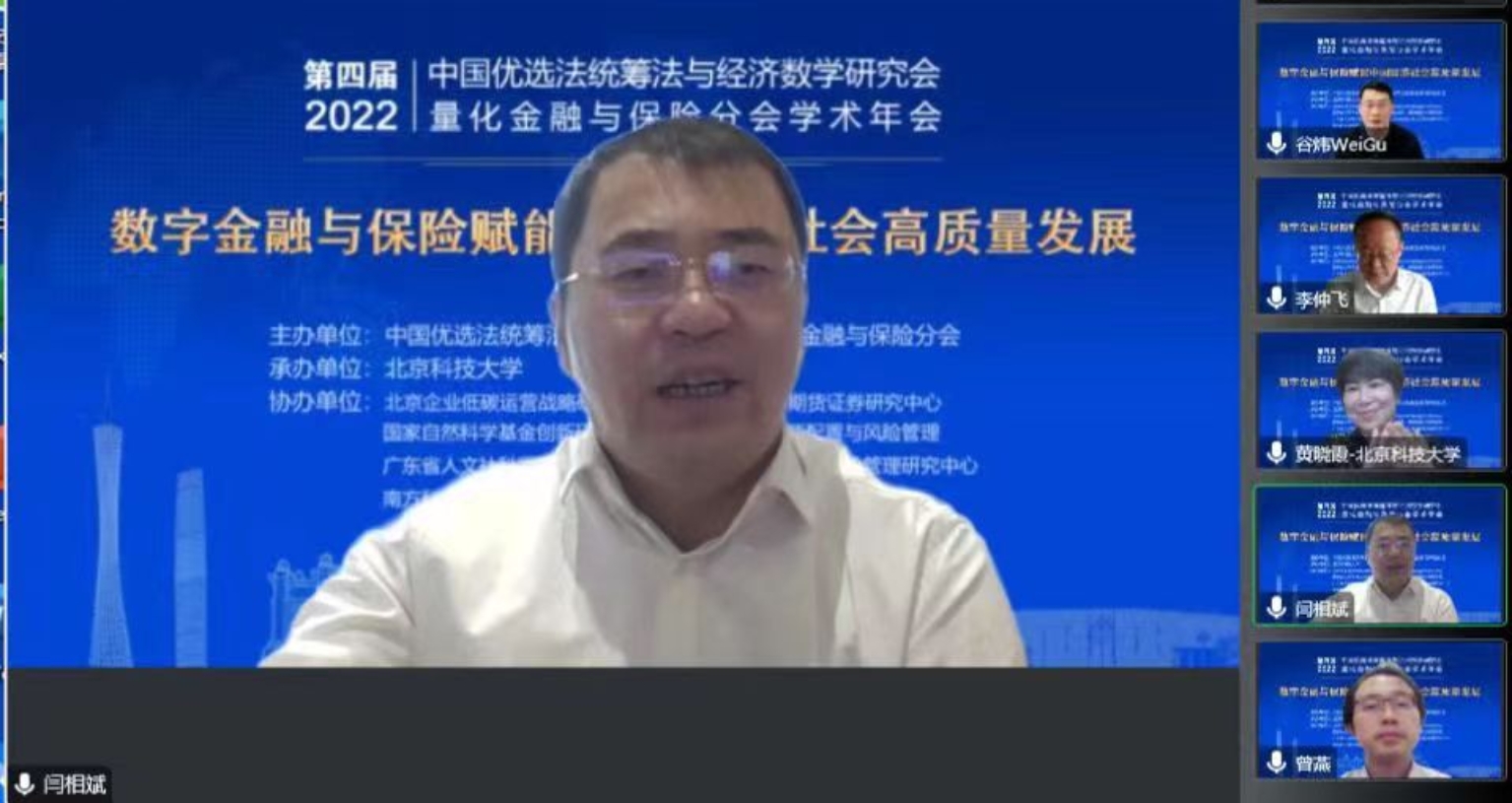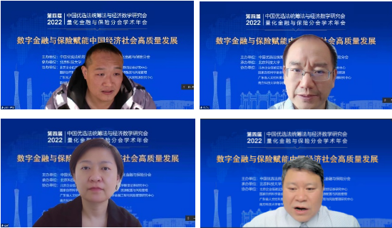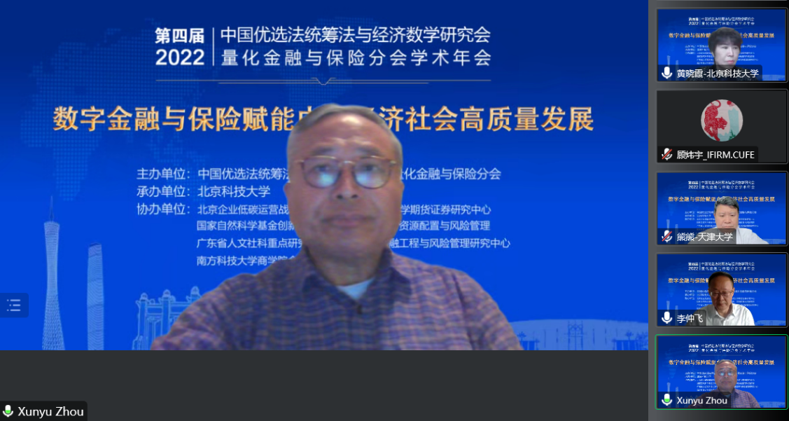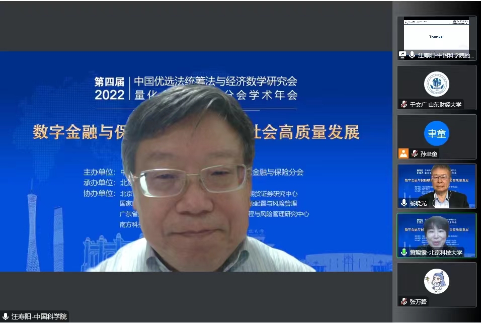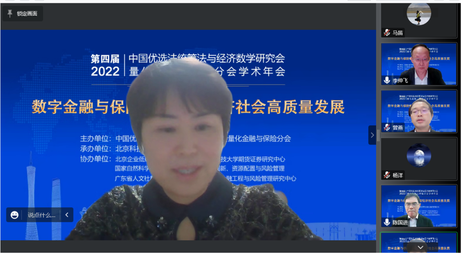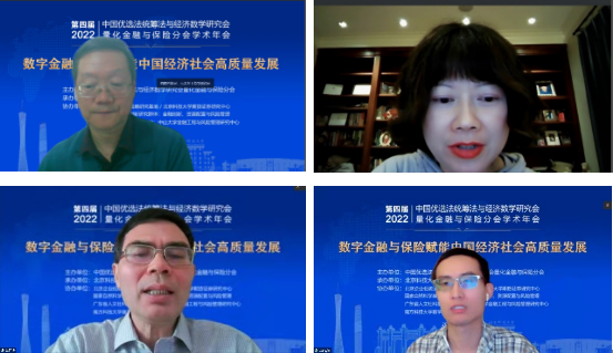 开幕式后,由国家自然科学基金委管理科学部副主任刘作仪、哥伦比亚大学的周迅宇教授、中国科学院的汪寿阳院士和中国科学院系统科学研究所副所长杨晓光研究员作大会报告。首先,刘作仪主任作了题为《2022年度基金项目资助及改革情况》的大会报告,详细介绍了2022年度管理学部基金资助情况和改革情况。然后,周迅宇教授作了题为《ReinforcementLearninginContinuousTimewithFinancialApplications》的大会报告,介绍了无模型连续时间强化学习及其在金融资产管理中的应用。上半场大会报告由大会主席李仲飞理事长主持。汪寿阳教授作了题为《加密货币的几个问题》的大会报告,从比特币挖矿谈起,通过几个案例来分析数字经济时代风险管理的一些新问题,并针对这些新问题,提出新理论、新方法与新技术,促进数字经济风险管理理论的研究与发展。最后,杨晓光研究员作了题为《数字经济的内在逻辑》的大会报告,报告指出了从卖方经济到买方经济的人类行为的变化,使得互联网和信息技术全面赋能经济各个环节,并阐述了数字经济的经济产出中市场和数据要素的重要性。下半场大会报告由2026年国际足联世界杯副院长黄晓霞教授主持。大会报告内容丰富、精彩纷呈,为参会人员呈现了一场量化金融与保险前沿研究的思想盛宴。大会报告期间通过腾讯会议参与大会报告学习讨论的人数达到了300上限,同时还有近500人通过线上直播的方式参与大会报告的学习。