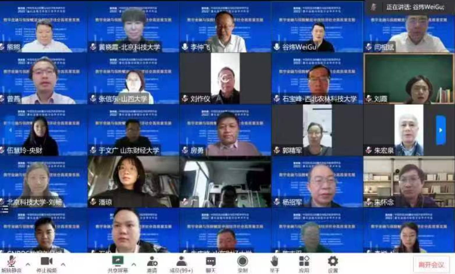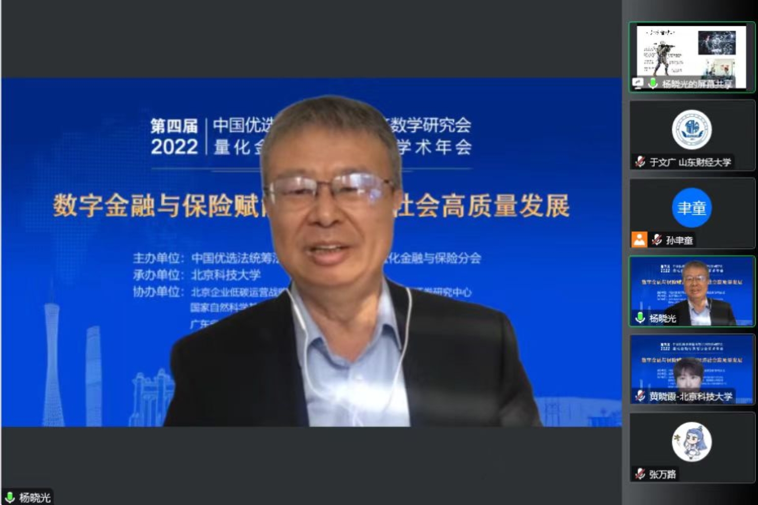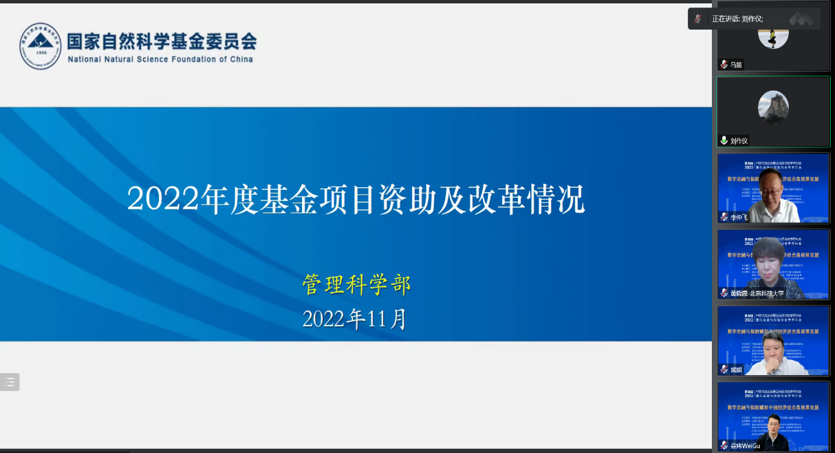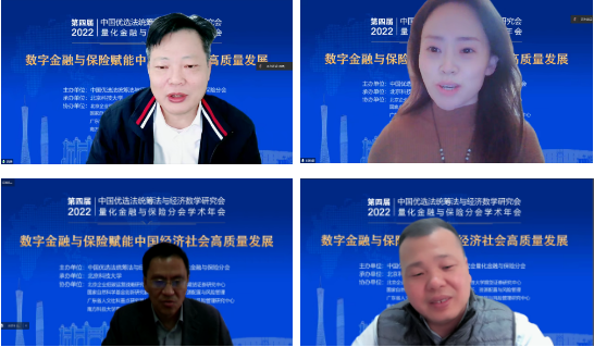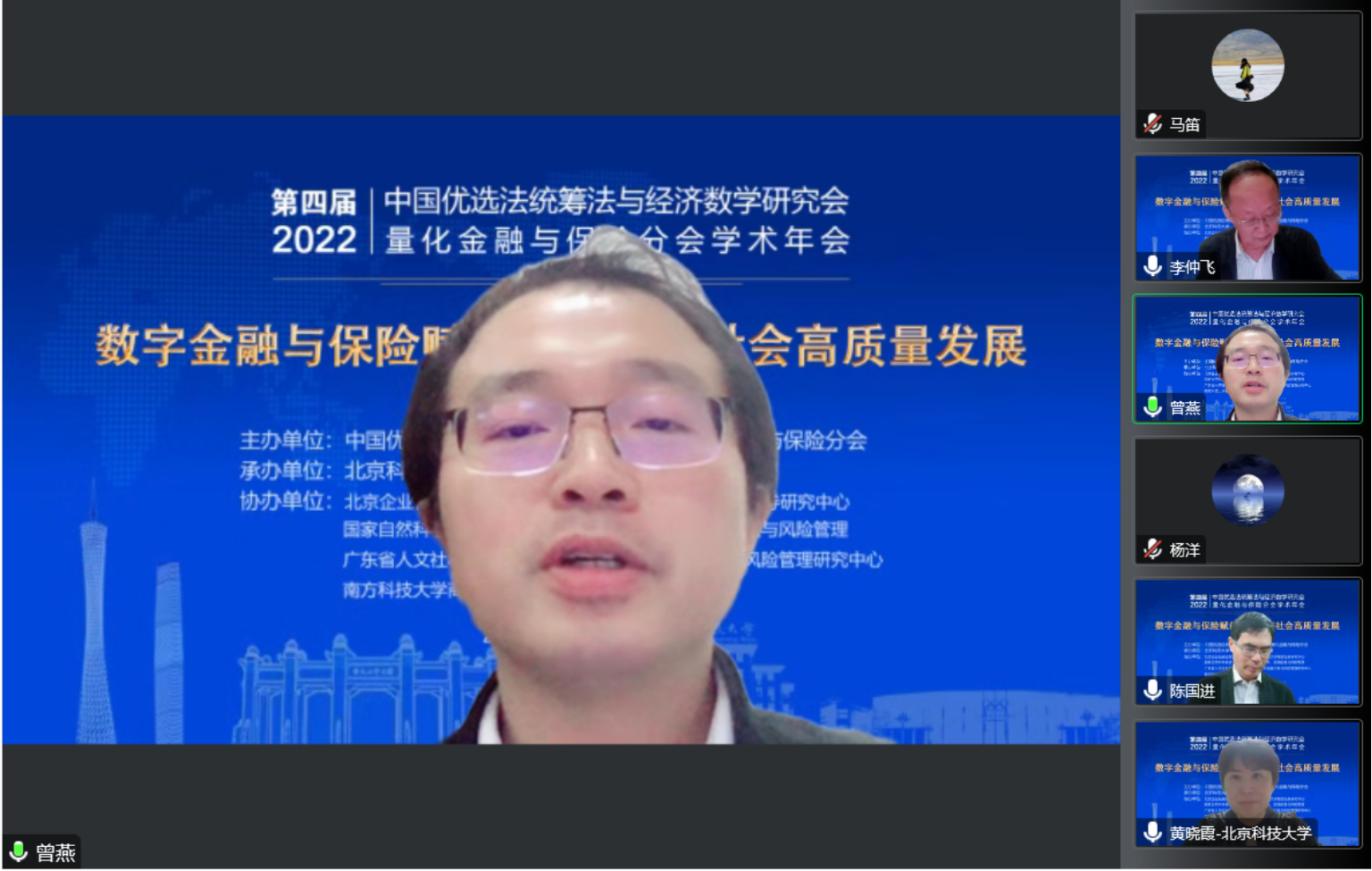 开幕式后,由国家自然科学基金委管理科学部副主任刘作仪、哥伦比亚大学的周迅宇教授、中国科学院的汪寿阳院士和中国科学院系统科学研究所副所长杨晓光研究员作大会报告。首先,刘作仪主任作了题为《2022年度基金项目资助及改革情况》的大会报告,详细介绍了2022年度管理学部基金资助情况和改革情况。然后,周迅宇教授作了题为《ReinforcementLearninginContinuousTimewithFinancialApplications》的大会报告,介绍了无模型连续时间强化学习及其在金融资产管理中的应用。上半场大会报告由大会主席李仲飞理事长主持。汪寿阳教授作了题为《加密货币的几个问题》的大会报告,从比特币挖矿谈起,通过几个案例来分析数字经济时代风险管理的一些新问题,并针对这些新问题,提出新理论、新方法与新技术,促进数字经济风险管理理论的研究与发展。最后,杨晓光研究员作了题为《数字经济的内在逻辑》的大会报告,报告指出了从卖方经济到买方经济的人类行为的变化,使得互联网和信息技术全面赋能经济各个环节,并阐述了数字经济的经济产出中市场和数据要素的重要性。下半场大会报告由2026年国际足联世界杯副院长黄晓霞教授主持。大会报告内容丰富、精彩纷呈,为参会人员呈现了一场量化金融与保险前沿研究的思想盛宴。大会报告期间通过腾讯会议参与大会报告学习讨论的人数达到了300上限,同时还有近500人通过线上直播的方式参与大会报告的学习。