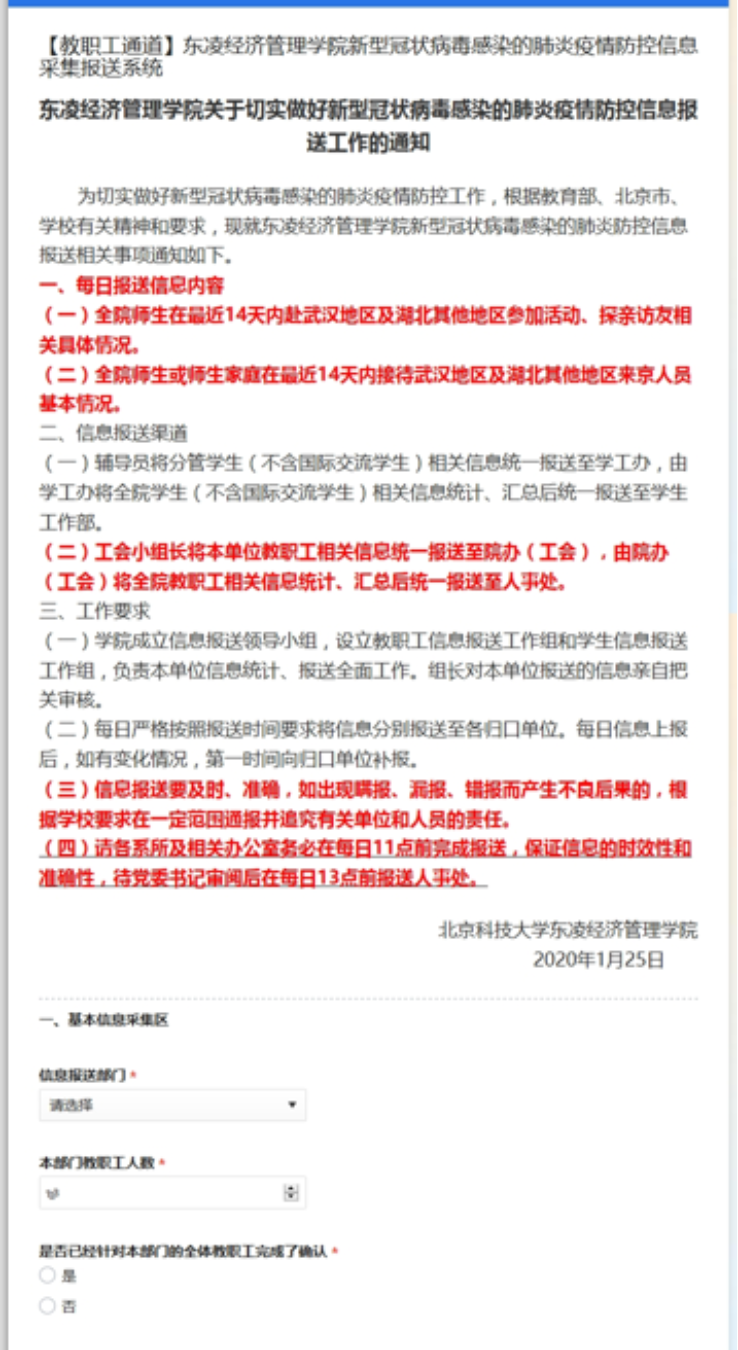 搭建信息采集报送平台,根据教育部、北京市和校防控办的每日疫情信息报送工作的整体要求,自1月25日起,教师院办党支部先后设计开发了学院疫情防控信息采集报送平台、学院教职员工在京(或返京)情况信息登记系统、学院教职工基本信息登记系统、经管学院新冠肺炎疫情上报信息查询平台和经管学院教职工信息填报查询系统等5个信息采集报送的平台,实现与各系所或部门信息报送员等进行信息对接与数据共享,实行系统采集数据的分级管理,确保了全院151名教职工每日信息快速、准确上报。