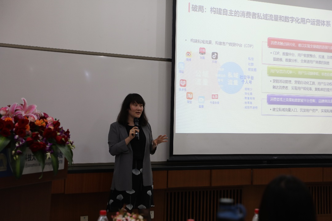 第一位分享的嘉宾是百分点首席数据科学家杜晓梦博士,她毕业于北京大学营销模型专业,专长于跨学科数据建模,拥有多年大数据技术与产业深度结合的实践经历。曾入选北京市科委“ 2018 年科技新星”,并在 Information System Research 等国际顶级学术期刊上发表论文。杜晓梦博士提出,技术飞速提升的时代企业做营销面临很多的挑战,消费者的触点碎片化,如何收集好不同渠道的消费者数据,如何打通线上线下的数据触点,做更全面的消费者洞察,成为营销人士关注的重点。首先,消费者数据要进行统一拉通不同触点数据进行整合管理,标签管理,之后进行建模分析,在数据分析基础之上进行营销。建立立体的营销方式,通过不同的营销用户权益管理工具,包括营销模板和技术的手段管理工具,实现对顾客更贴心更实时的交互。建立私域流量的入口,沉淀客户资源,公域的流量转化为自己的流量池,在自己的流量池里形成用户价值的提升,及满意度忠诚度的提升。百分点是中国领先的数据智能技术企业,拥有完整的大数据和认知智能产品线,并善于将这样的技术与产品赋能到零售、媒体、银行等行业。